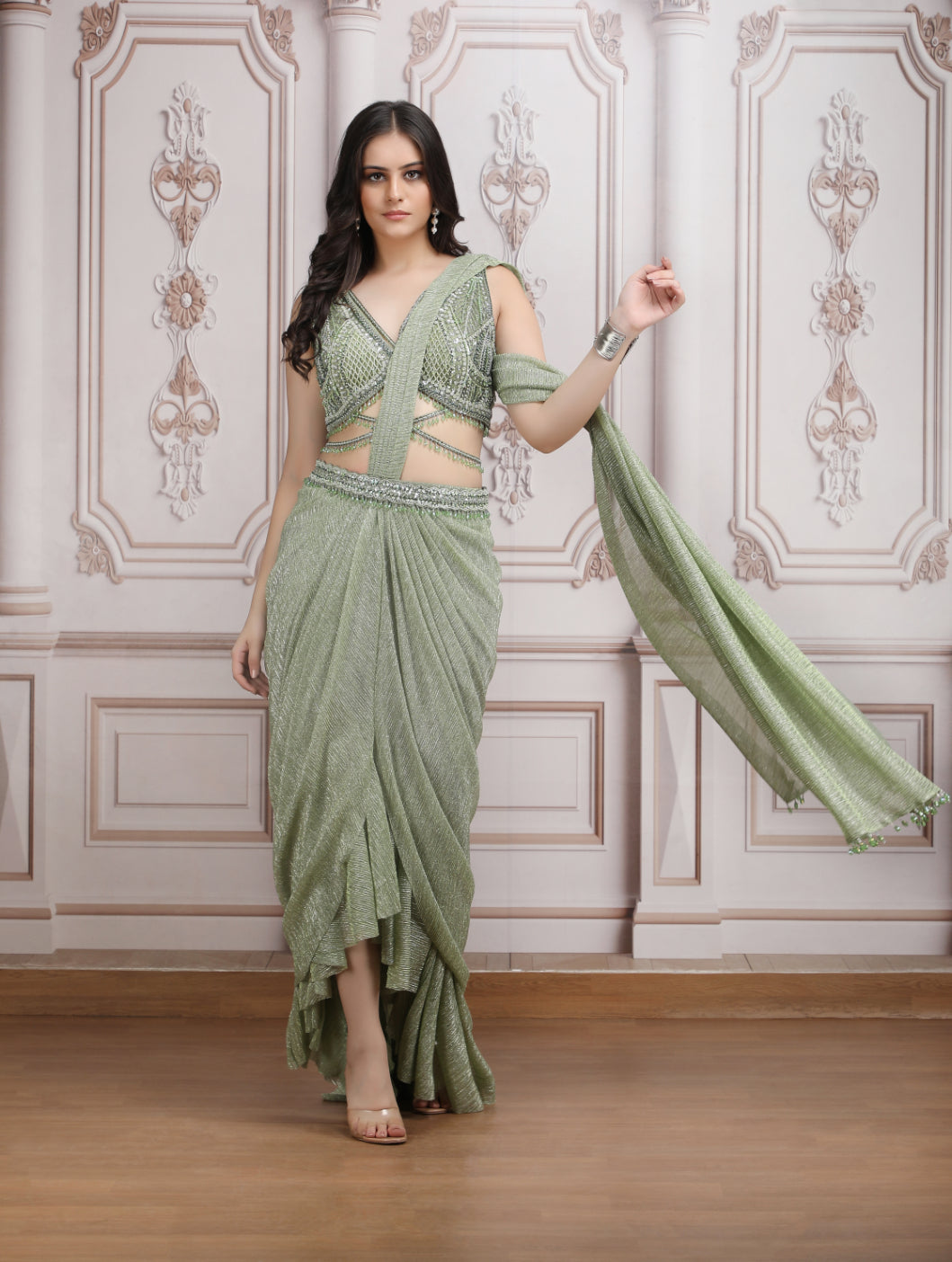 This stunning sage green pre-draped saree features intricate sequin work and a modern blouse with bold cut-outs and cold-shoulder detailing. Effortlessly blending traditional charm with contemporary flair, it's an ideal choice for cocktail events or festive.
