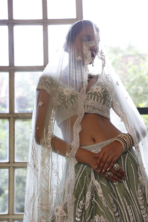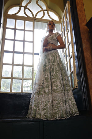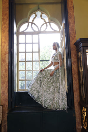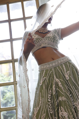 Lehenga: Sage net lehenga with abstract floral and geometric embroidery in off-white cutdana, beads, sequins and silver diamond work finished with embroidered scalloped hem | Choli: Sage net choli with cap sleeves and basque. It has embroidery of off-white cutdana, beads, sequins and silver diamonds in abstract floral pattern and border form on the basque | Dupatta: Embroidery of off-white cutdana, beads, sequins and silver diamonds in floral pattern on the 2 edges of dupatta with buttis all over and geometric border on the hem