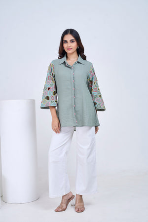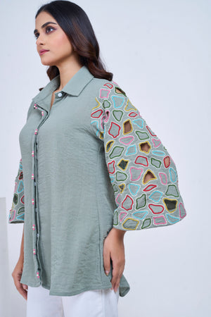 A breezy sage green shirt featuring geometric mosaic-inspired sleeves in earthy tones. This button-down style merges minimal structure with playful artistry — perfect for layering or styling solo for your weekday edits.