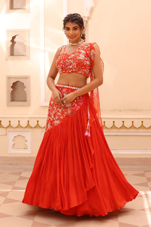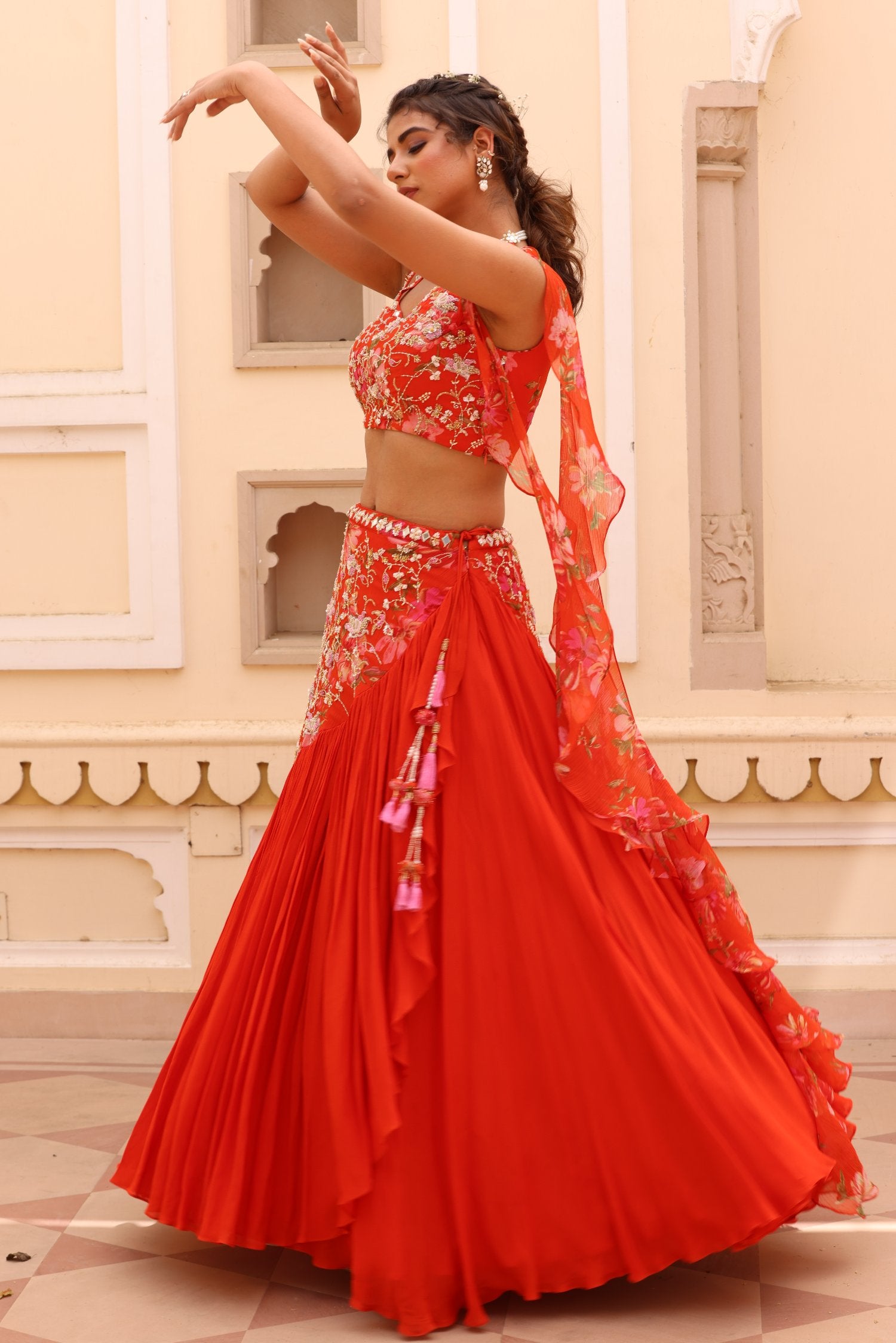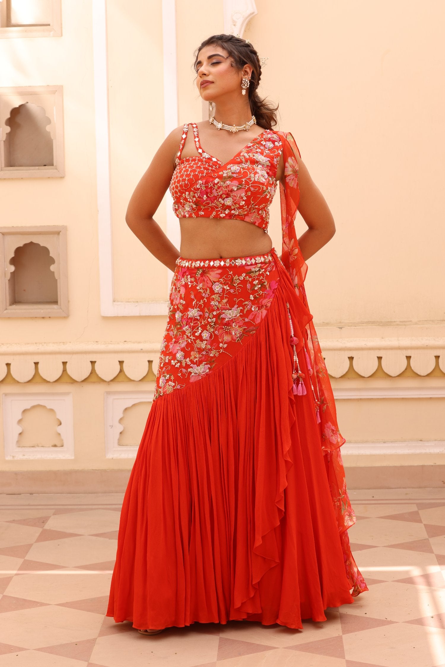 Georgette crepe lehenga with fish cut embroidered style on both front and back. Paired with one shoulder embroidered blouse with attached chiffon double ruffled dupatta