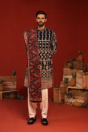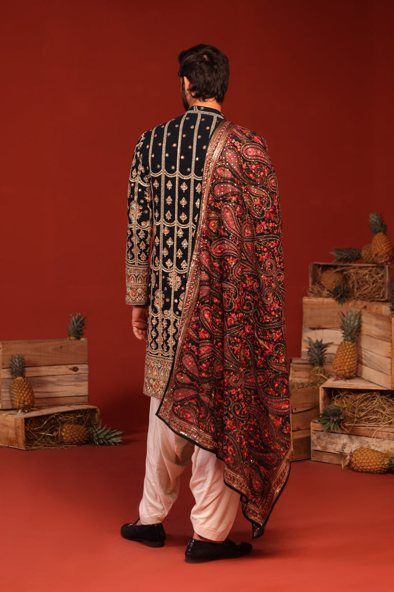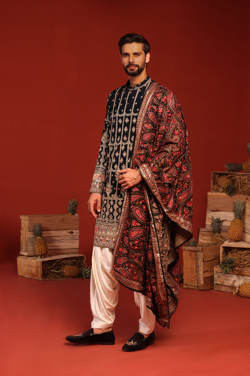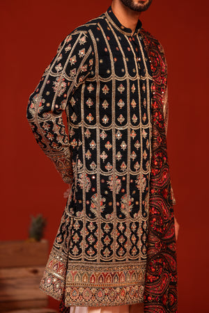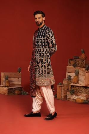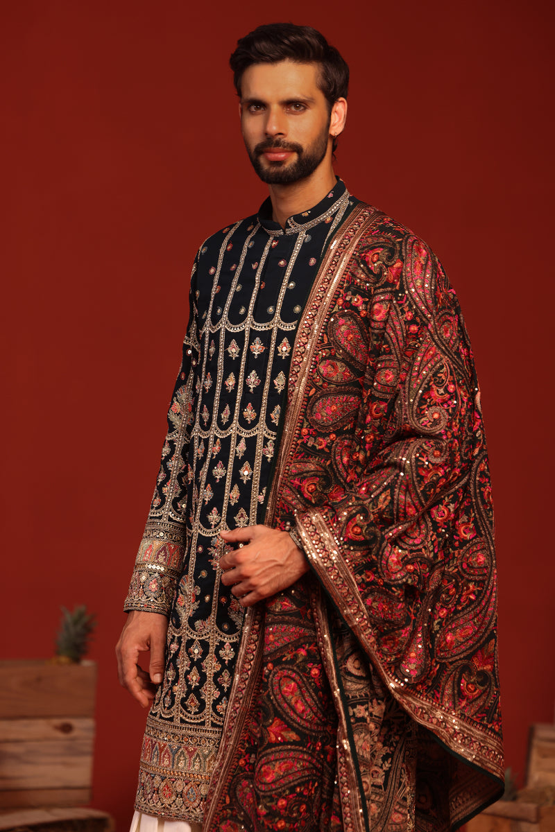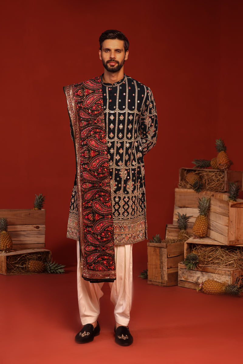 This kurta is adorned with intricate reshom and sequinned embroidery, offering a two-pocket design and pure viscose lining for comfort. The ivory Patiala and a dupatta with heavy embroidery make it an exquisite choice for celebrations.