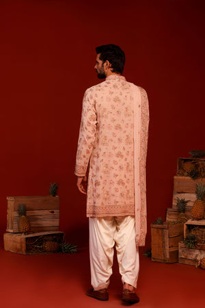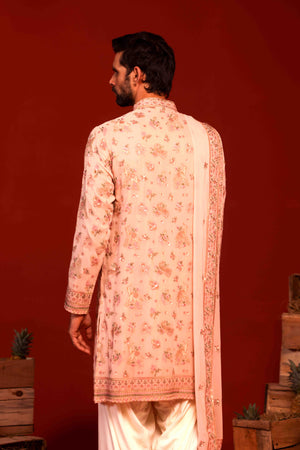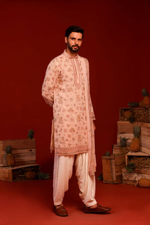 Adorned with intricate reshom and sequinned embroidery, this kurta includes two pockets and a viscose lining for all-day comfort. Paired with an ivory Patiala and a heavily embroidered dupatta, it is ideal for special occasions.