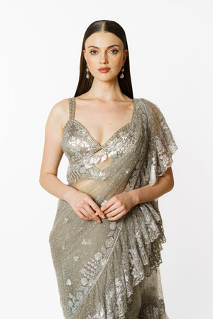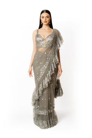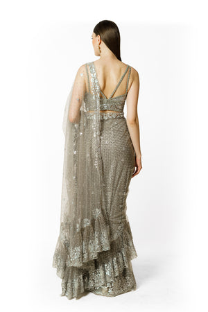 Silver Grey Embroidered Tulle Frill Saree With Fully Embo. Blouse Abd Peticoat