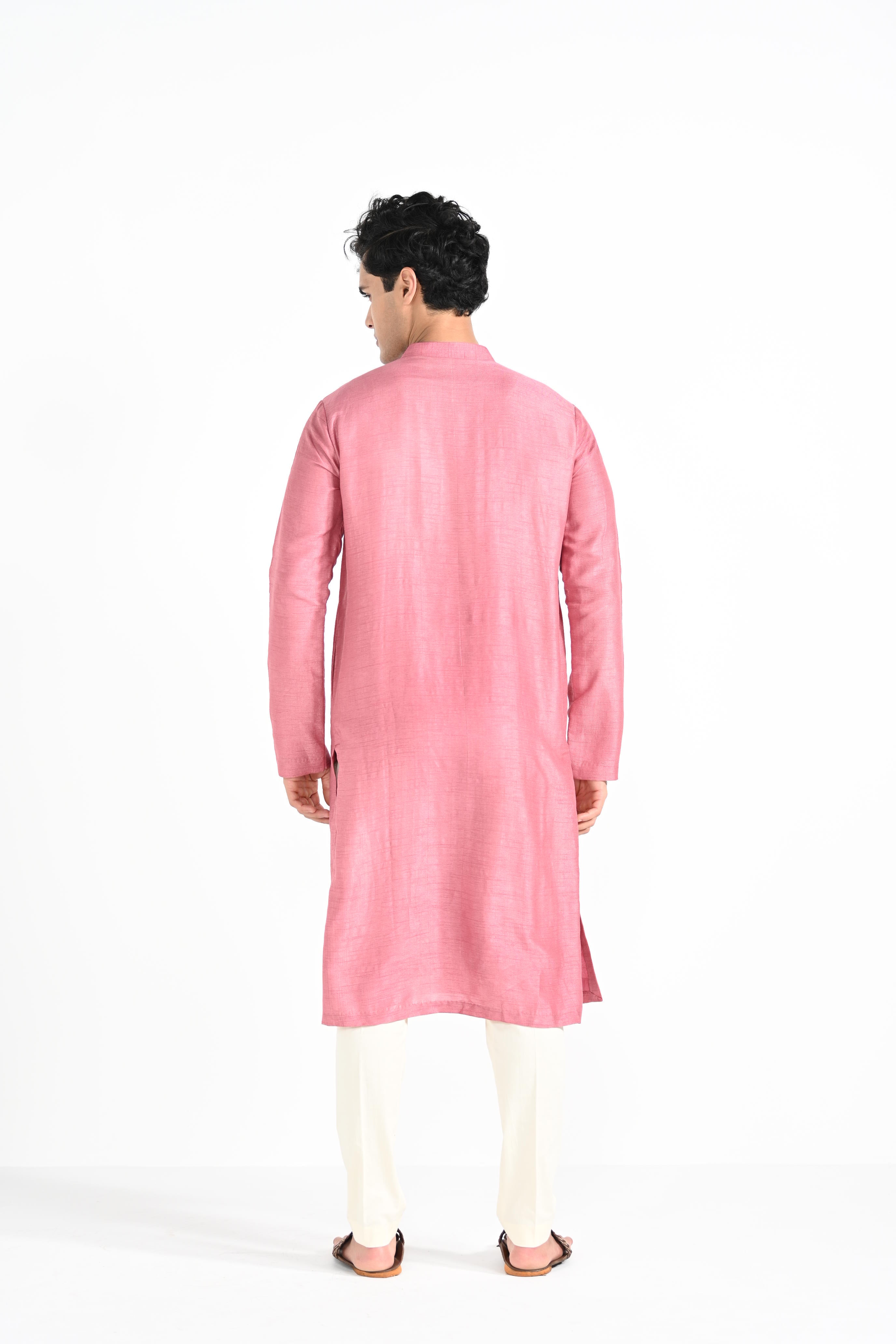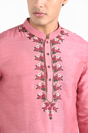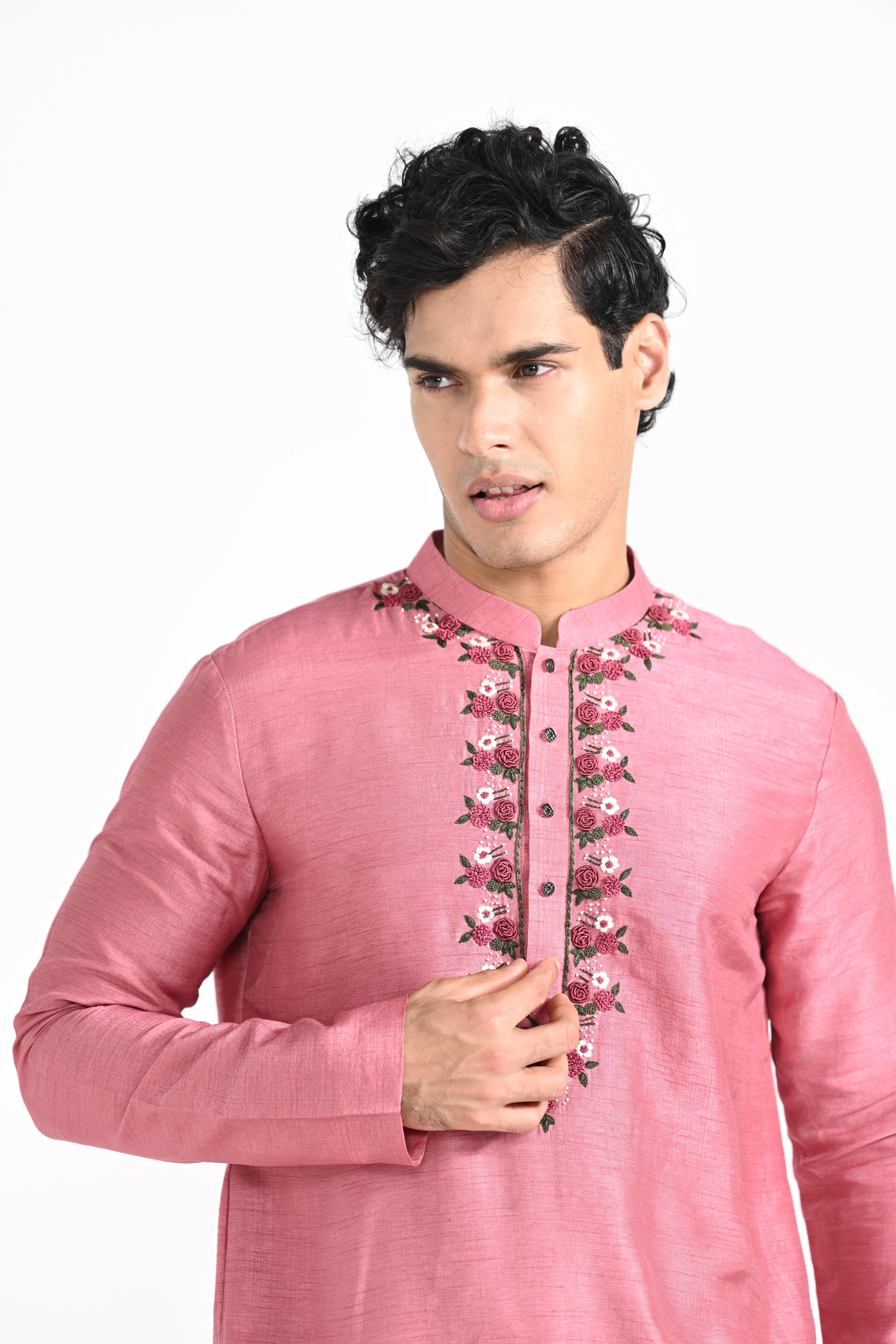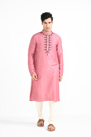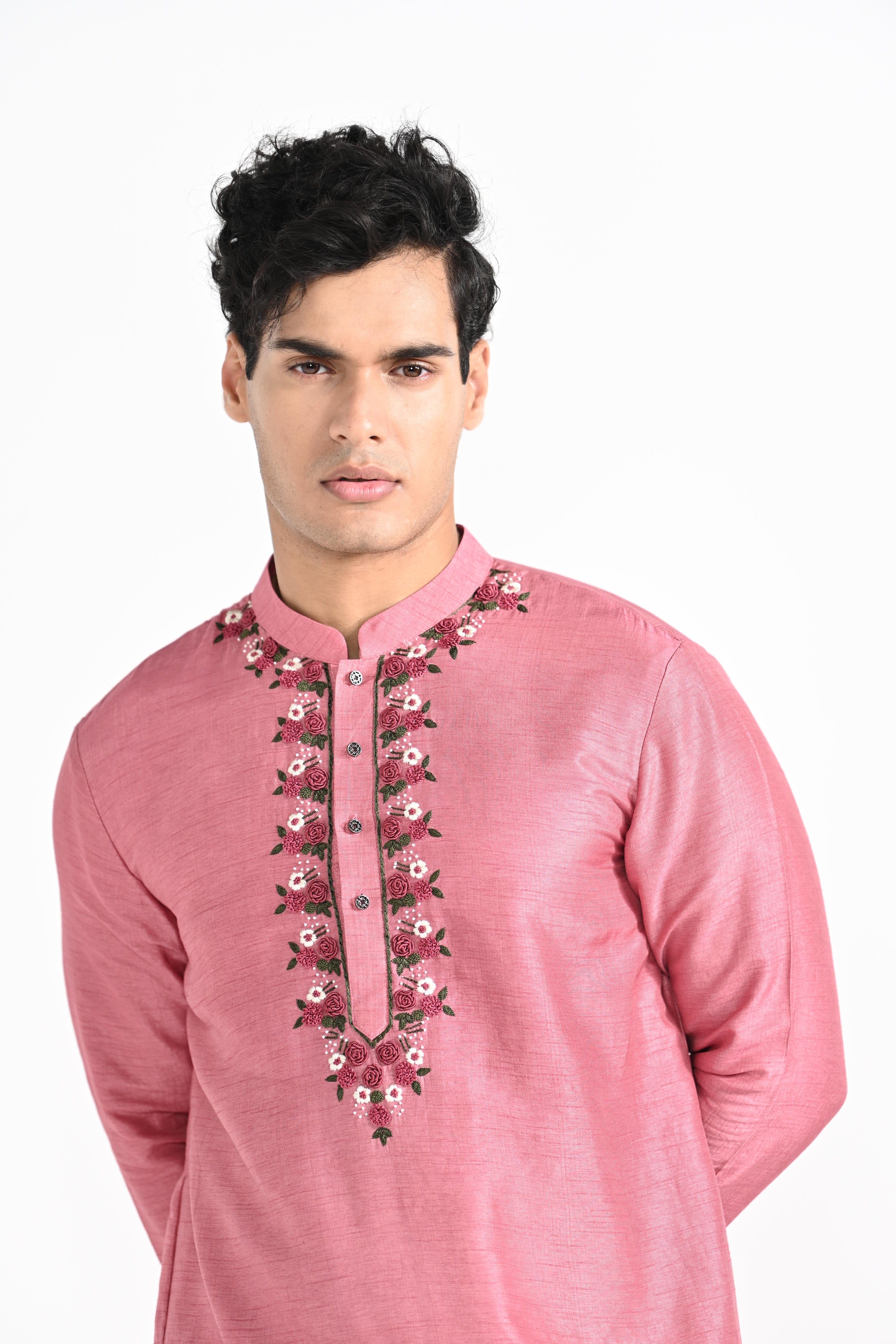 Salmon Pink hand emboidered thread work on bamberg raw silk.Paired with Buttercream slim fit Pant Pajama. Color of the actual garment may vary due to lighting conditions during the shoot .