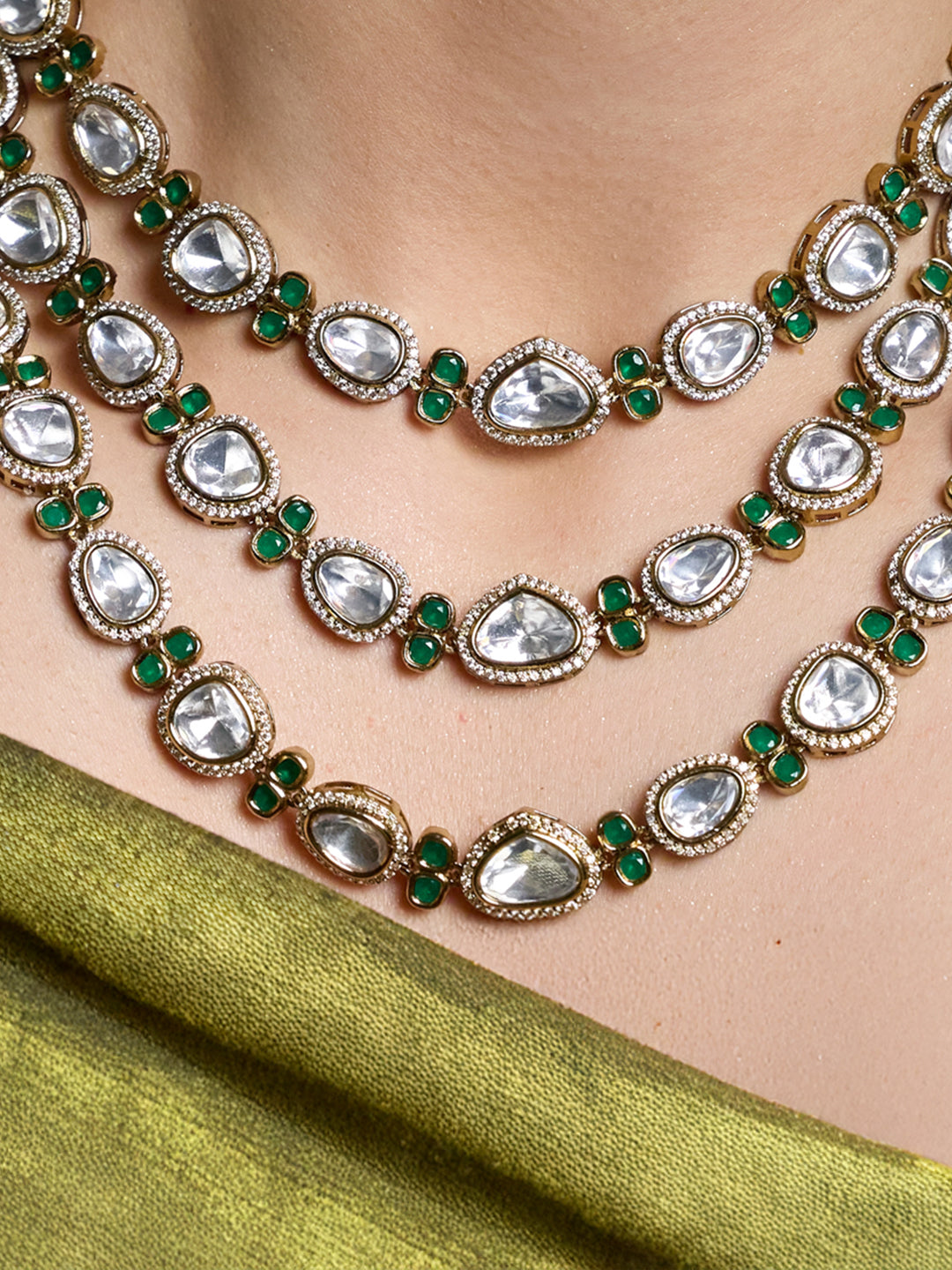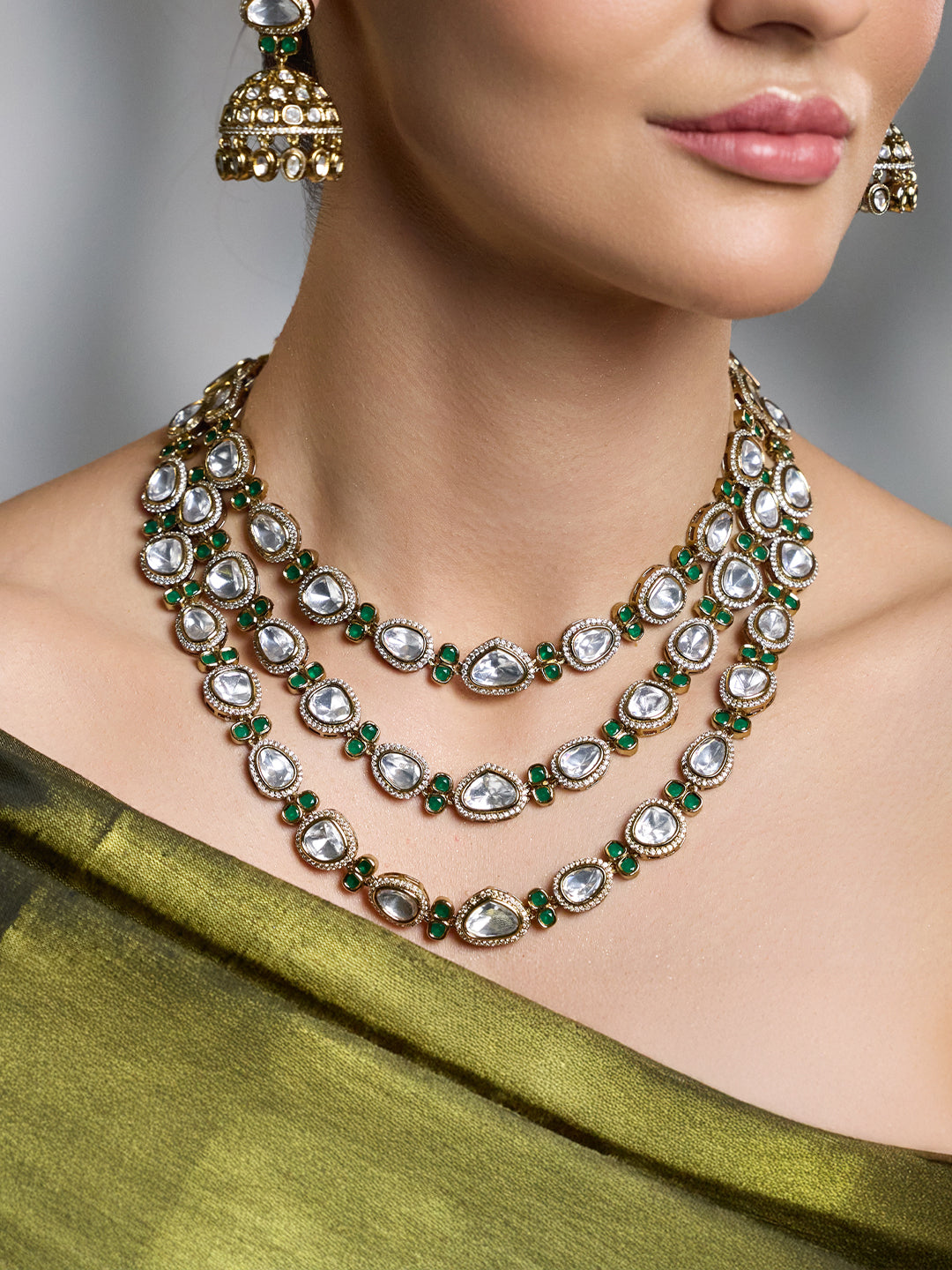 Stunning three-layered Kundan Rani Haar with green accents and gold finish, paired with traditional jhumka earrings. Ideal for weddings and festive celebrations, offering a majestic, regal appearance.