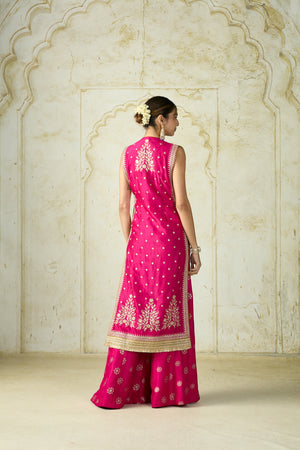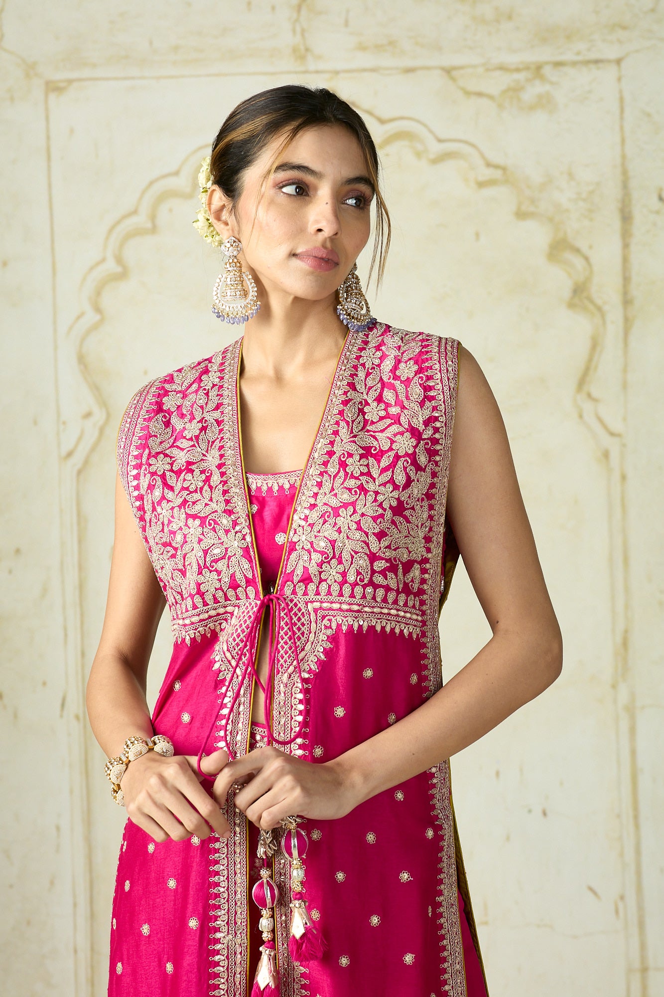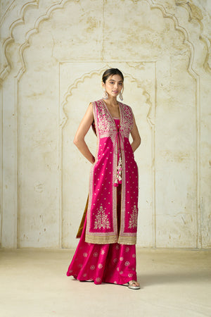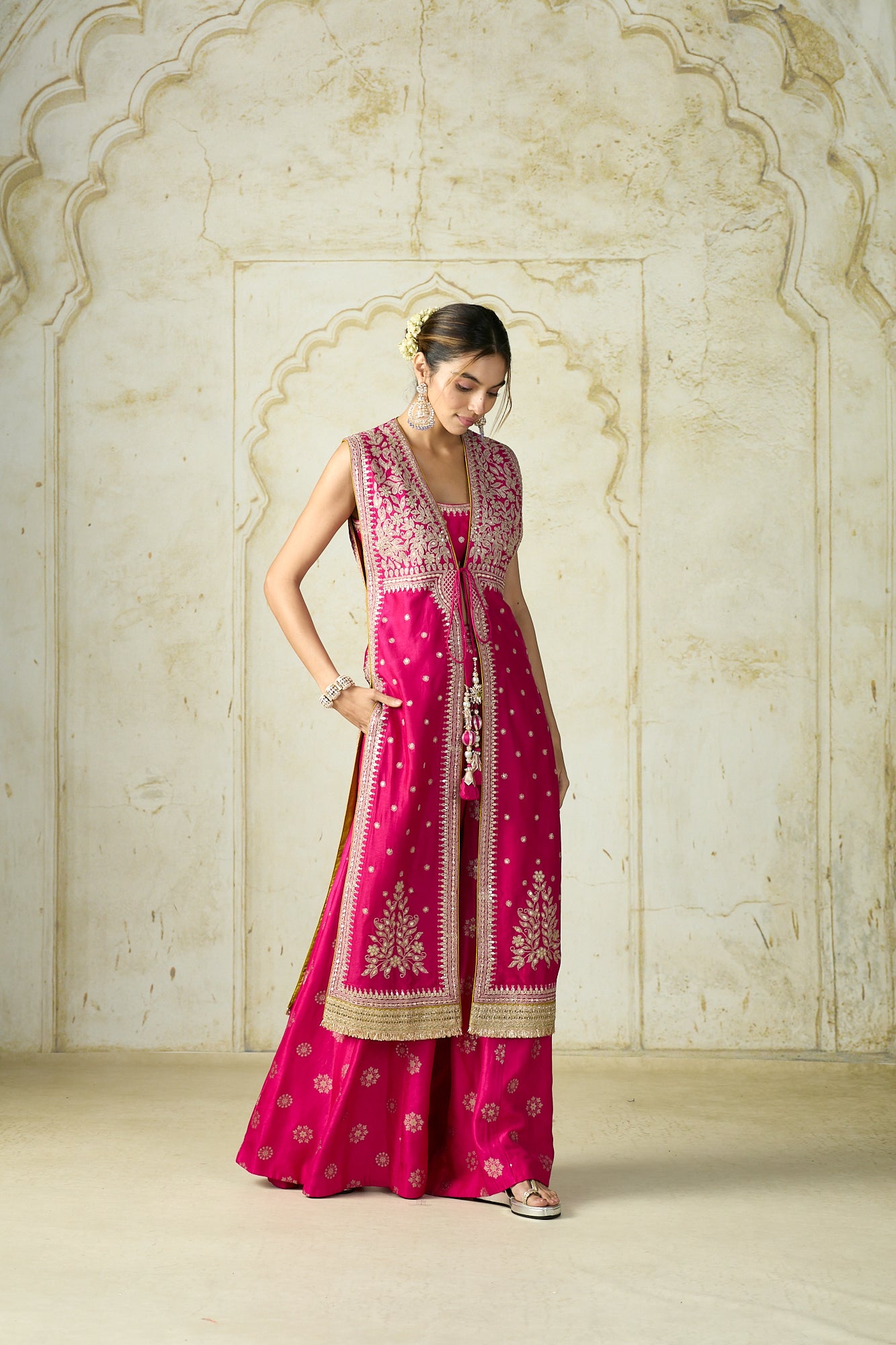 Featuring a sleeveless long jacket-style kurta richly adorned with intricate embroidery, delicate motifs, and a tasseled tie-up at the front. The kurta is paired with matching wide-legged pants, decorated with scattered designs that add a graceful flow to the outfit.