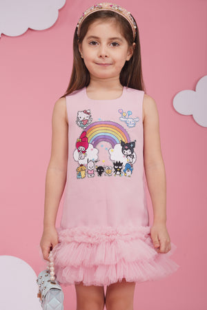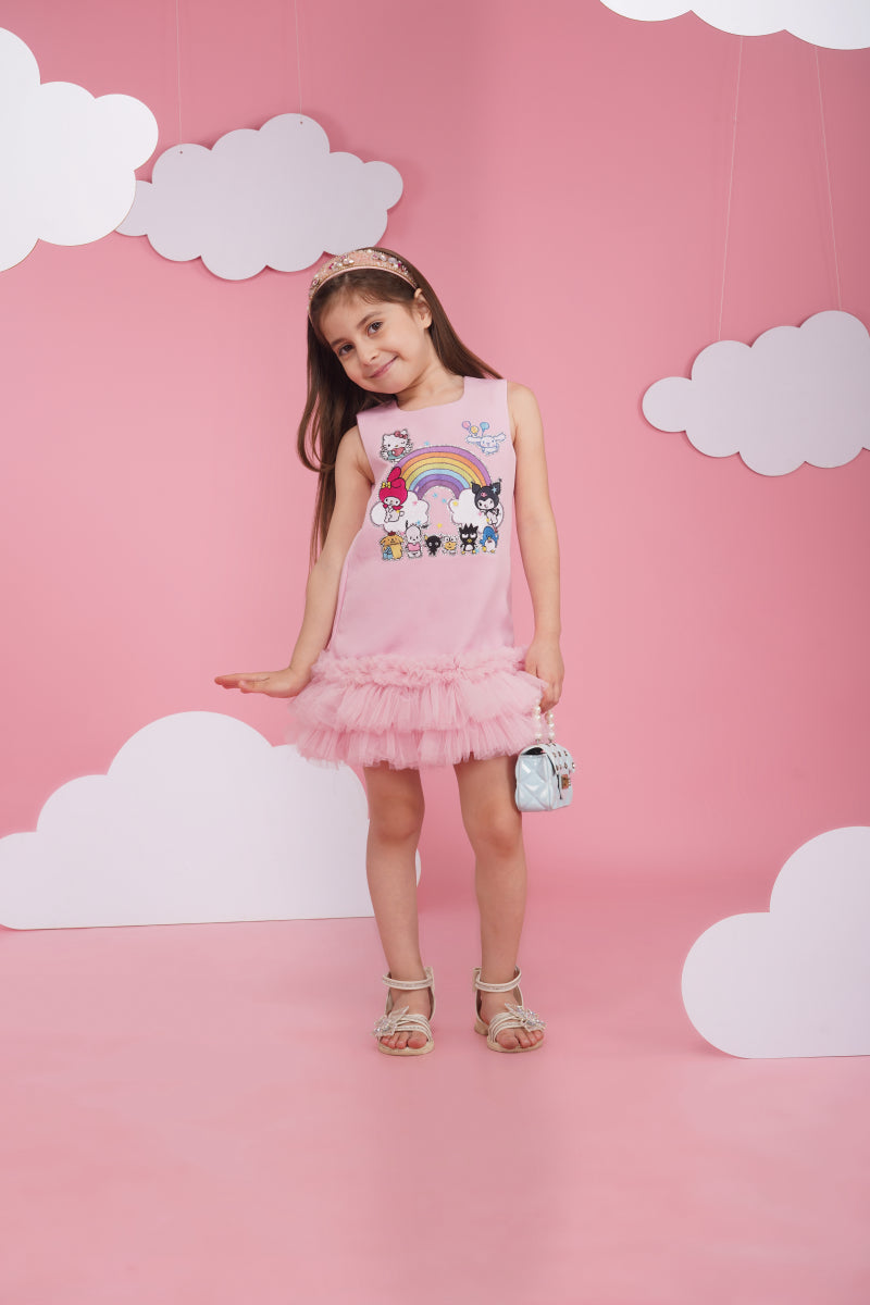 A pink luxury crepe dress with sanrio characyers embroidery in the front and tulle frilling in the bottom