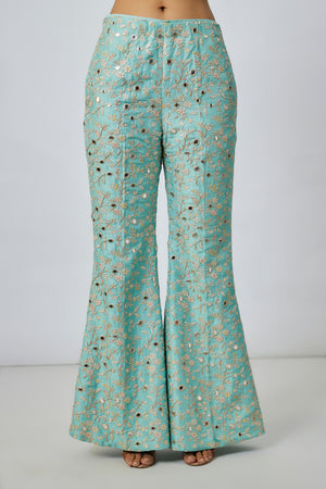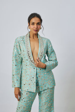 This pantsuit features a tailored blazer intricately embellished with delicate floral jaal embroidery and mirror work, featuring a plunging neckline. Paired with flared trousers that echo the same detailed embellishments striking boldness.