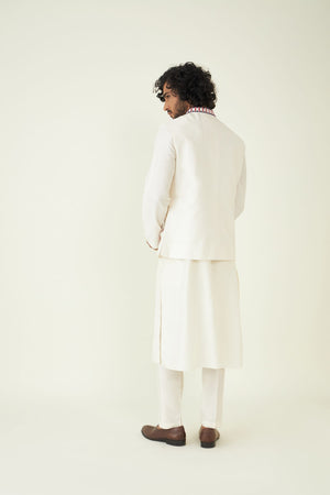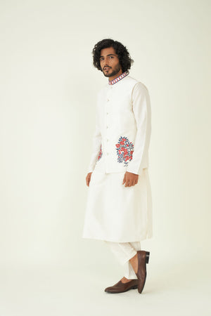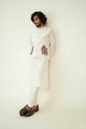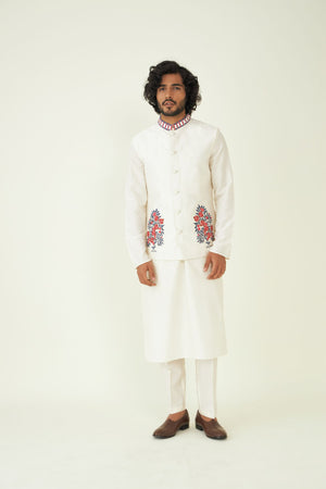Off-White Resham Embroidered Menswear Bundi. The classic ivory hue of the Bundi exudes understated charm and sophistication, making it a versatile choice for various events. The Bundi features a mandarin collar, infusing a touch of contemporary refinement into the traditional attire.
