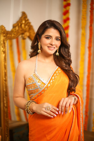 A classic drape saree with delicate gold embroidery lifts the patterns and add grace, paired with a beautiful sleeveless blouse speaks of opulence and grandeur, gold and silver, jewel colours that are reminiscent of royalty!