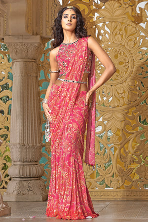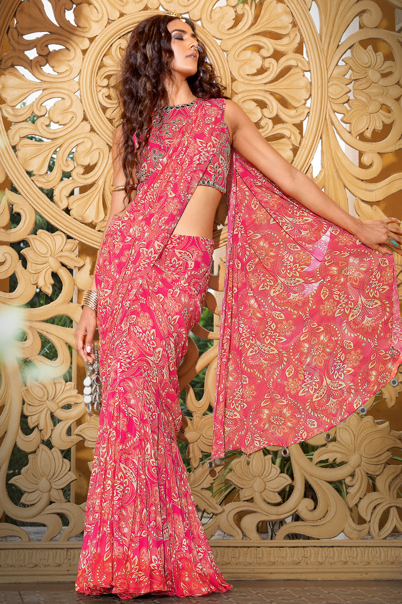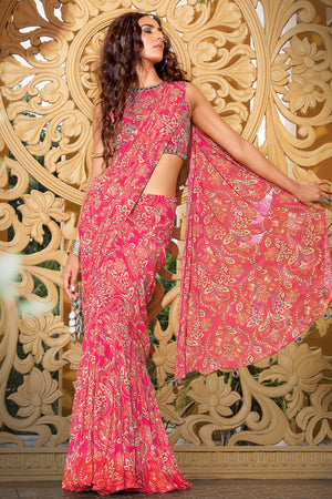 Step into the spotlight in this radiant rani pink printed georgette saree from Sajeda Lehry’s celebratory RAANGBAAZ collection — a tribute to those fleeting moments when joy takes center stage, voices rise with laughter, eyes sparkle a little more, and hearts brim with emotion. Crafted in lightweight printed georgette, this saree drapes effortlessly, offering movement and grace with every step. It’s paired with a coordinated printed blouse, richly adorned with all-over hand-embroidered mirror work — capturing light and attention in equal measure. Whether you're dressing for a festive evening or a vibrant daytime gathering, this look is made for memories.