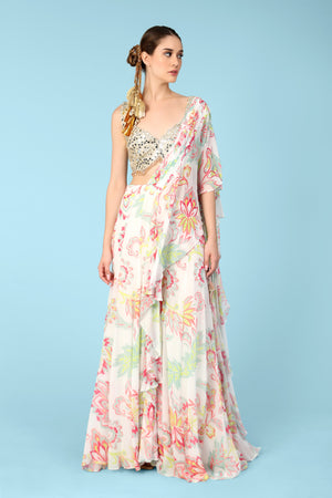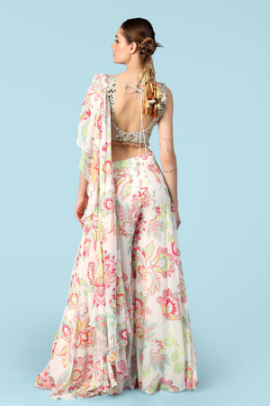 Introducing our luxurious, pre-stitched pallazo sari in soft silk georgette, designed for effortless elegance. Featuring a beautiful blouse crafted from pure silk, exuding a subtle opulence; enhanced with intricate hand-embroidery and trimmed with beautiful crystal drops, it will surely make a stunning entrance at any event. Suitable for all occasions, this is pure luxury.