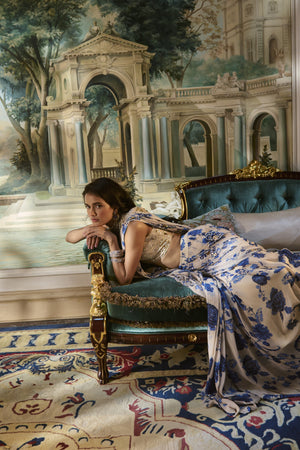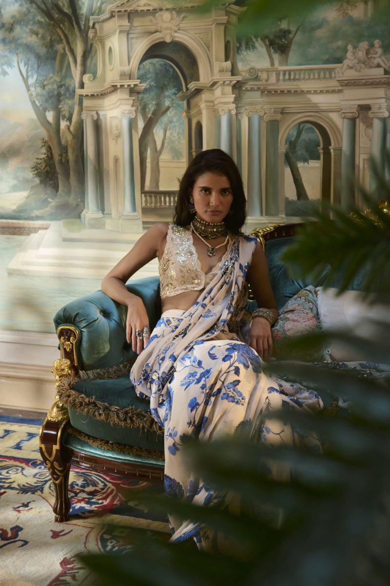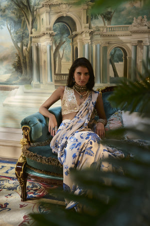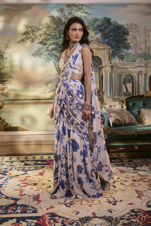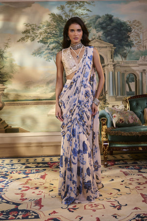 An ivory pre-draped saree, featuring a deep V-neck blouse that is fully embroidered in intricate detail and finished with scalloped edges on all sides. The saree is crafted in chiffon fabric, printed with delicate blue florals and highlighted with hand embroidery. A modern silhouette blended with traditional charm, perfect for effortless elegance.