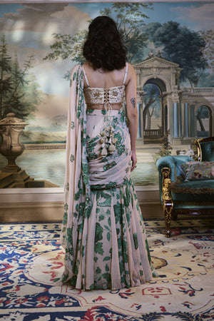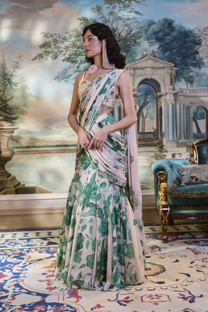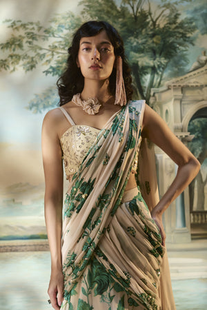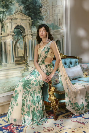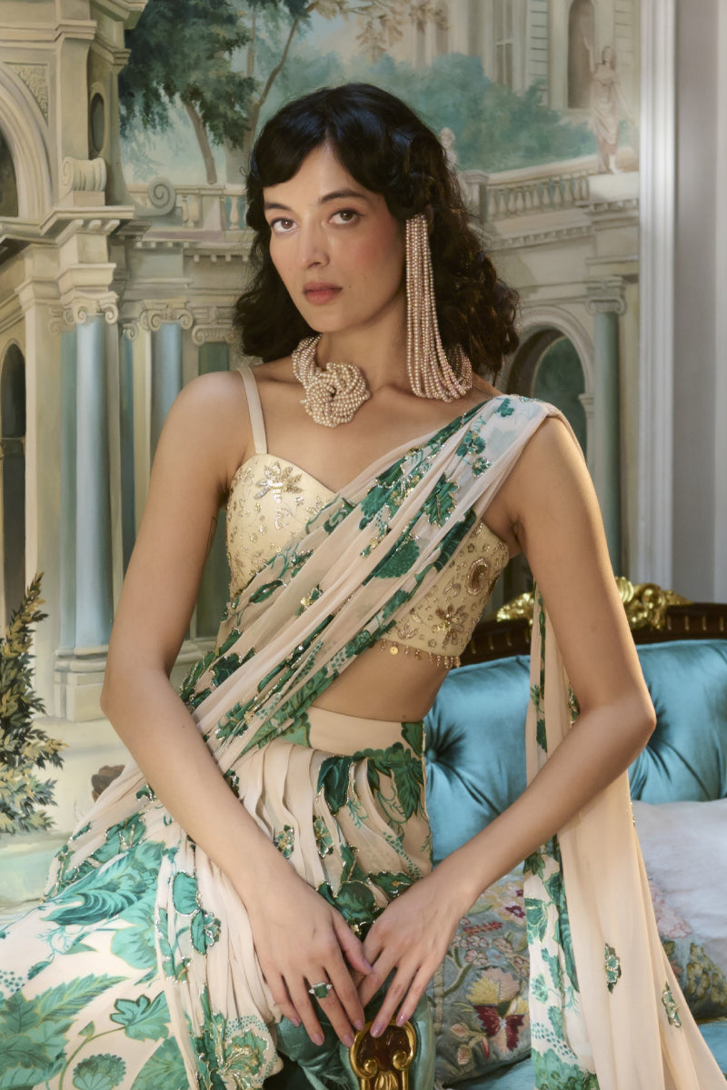 An ivory pre-draped saree crafted in airy chiffon, adorned with rich green floral prints and delicate hand-embroidered detailing that adds an elegant touch to its fluid drape. Paired with a sweetheart-neck blouse intricately finished with hand embroidery and beadwork, this finely pleated ensemble beautifully blends traditional charm with contemporary sophistication—perfect for summer celebrations.