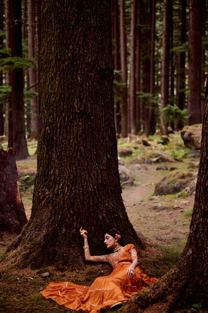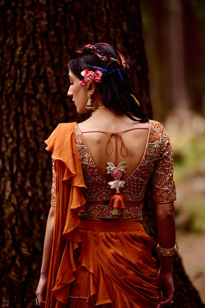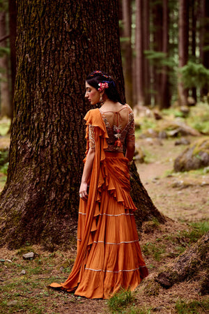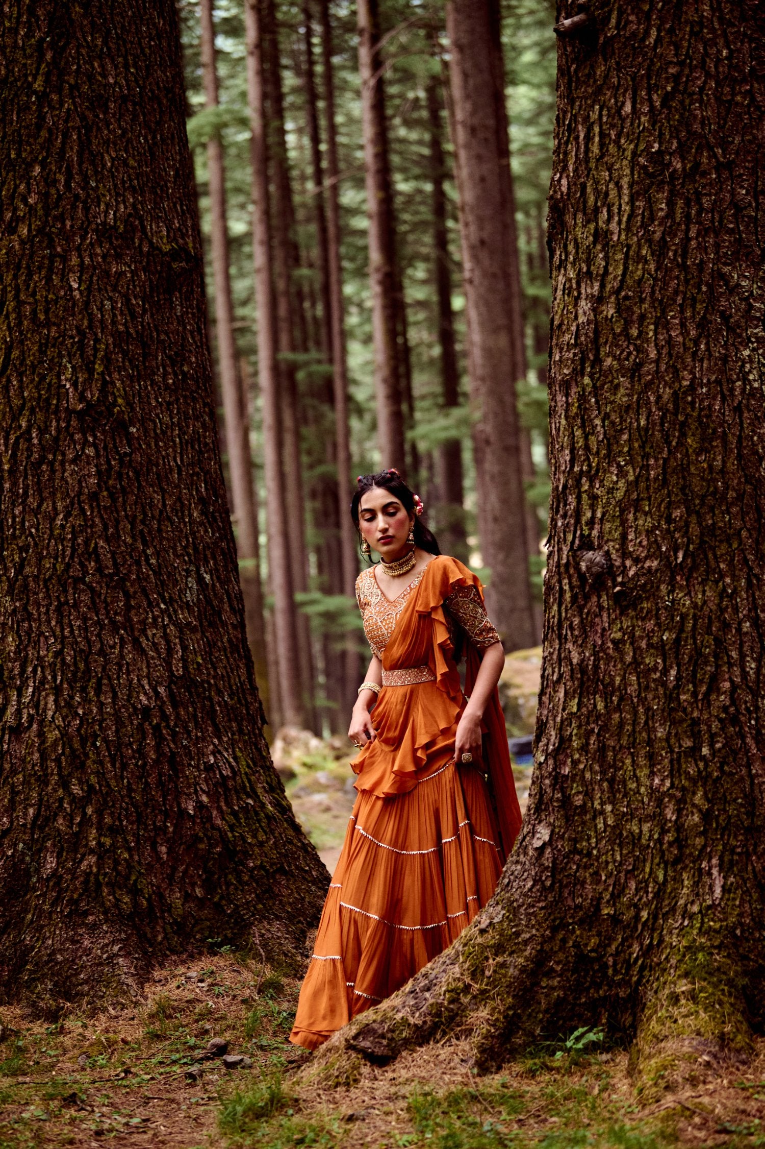The Rust Orange 4- Layered Pre-Draped Saree Comes With Dainty Gota Patti Borders Along With Naksha Embroidered Blouse Embellished With Dabka Work, Mirror, Moti, Cutdana And Zari Work Paired With Geometric Belt ; Works Well From Day Wear To Evening Look