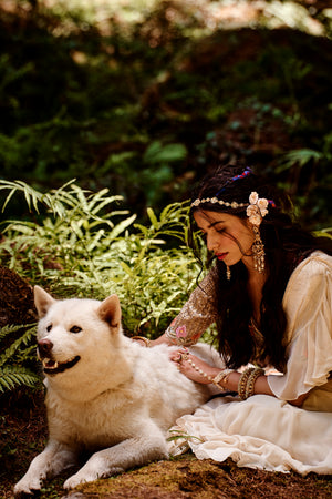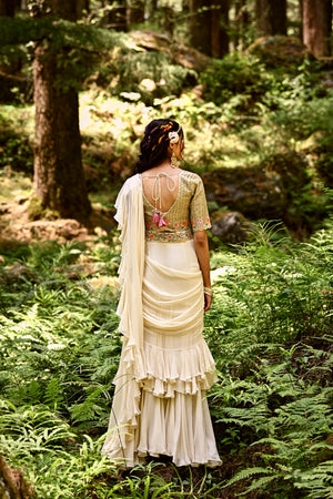 Our Off White 2 Layered Pre Draped Saree Is Paired With Floral Belt And Hand Embroidered Blouse Embellished With Dabka Work, Sequins,Resham Work,Moti And Cutdana Is An Easy Pick For Summer Weddings