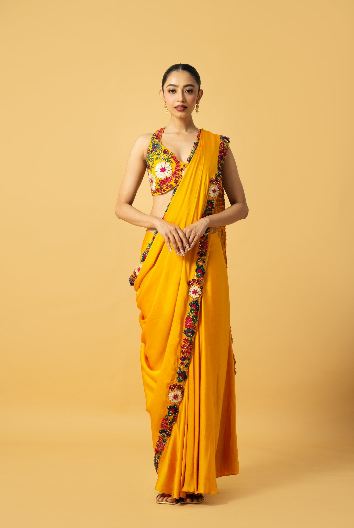 Golden Yellow Modal Satin Saree With Multi Coloured 3D Work On Blouse And Saree Edge . Hand Embroidery Consists Of Multi Coloured 3D Work
