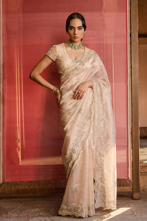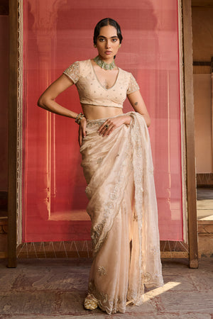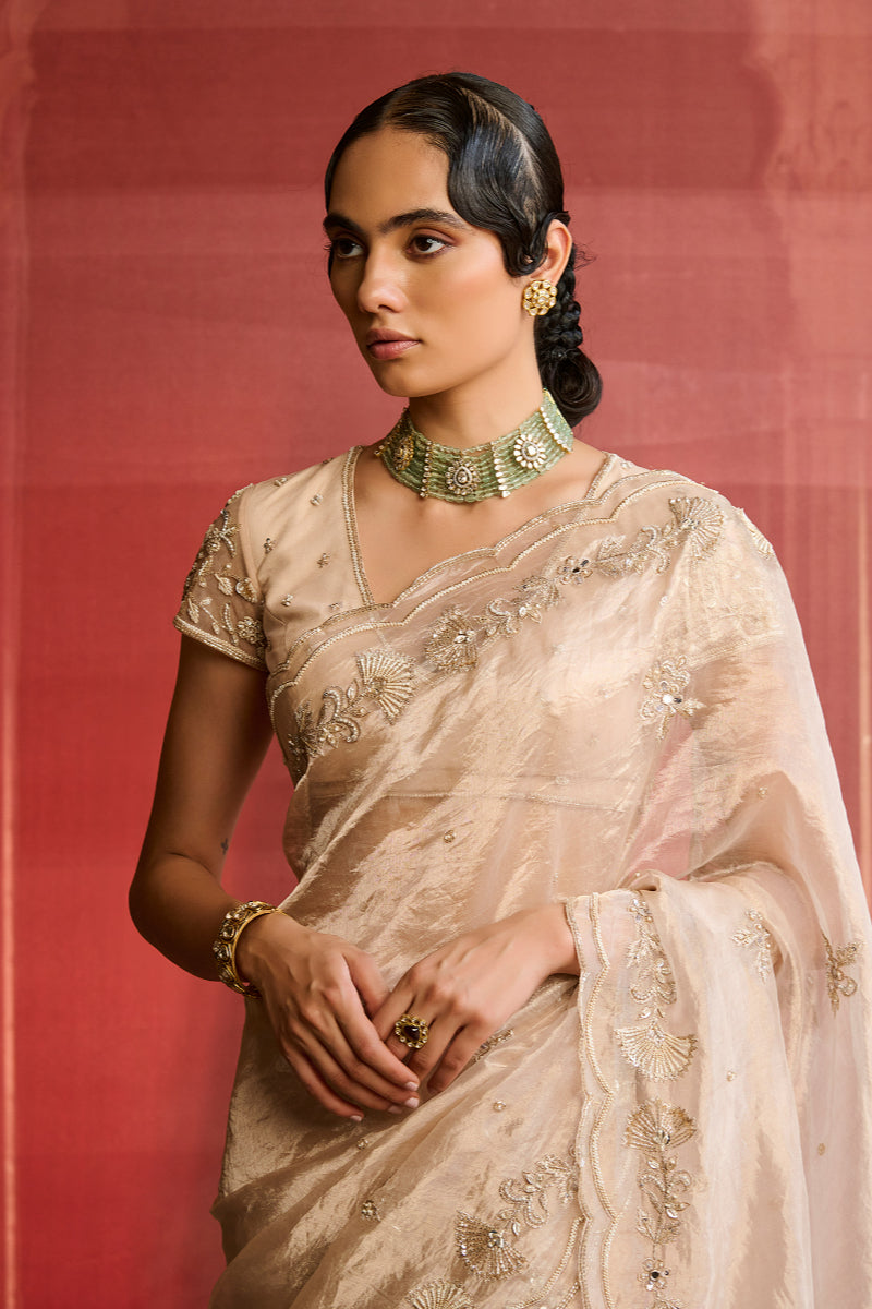 Featuring a classic rose gold silk tissue saree with heavy embroidered border and floral motifs spread all over the saree. It is paired with a matching blouse in net with embroidered short sleeves and motifs spread all over the blouse.