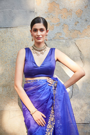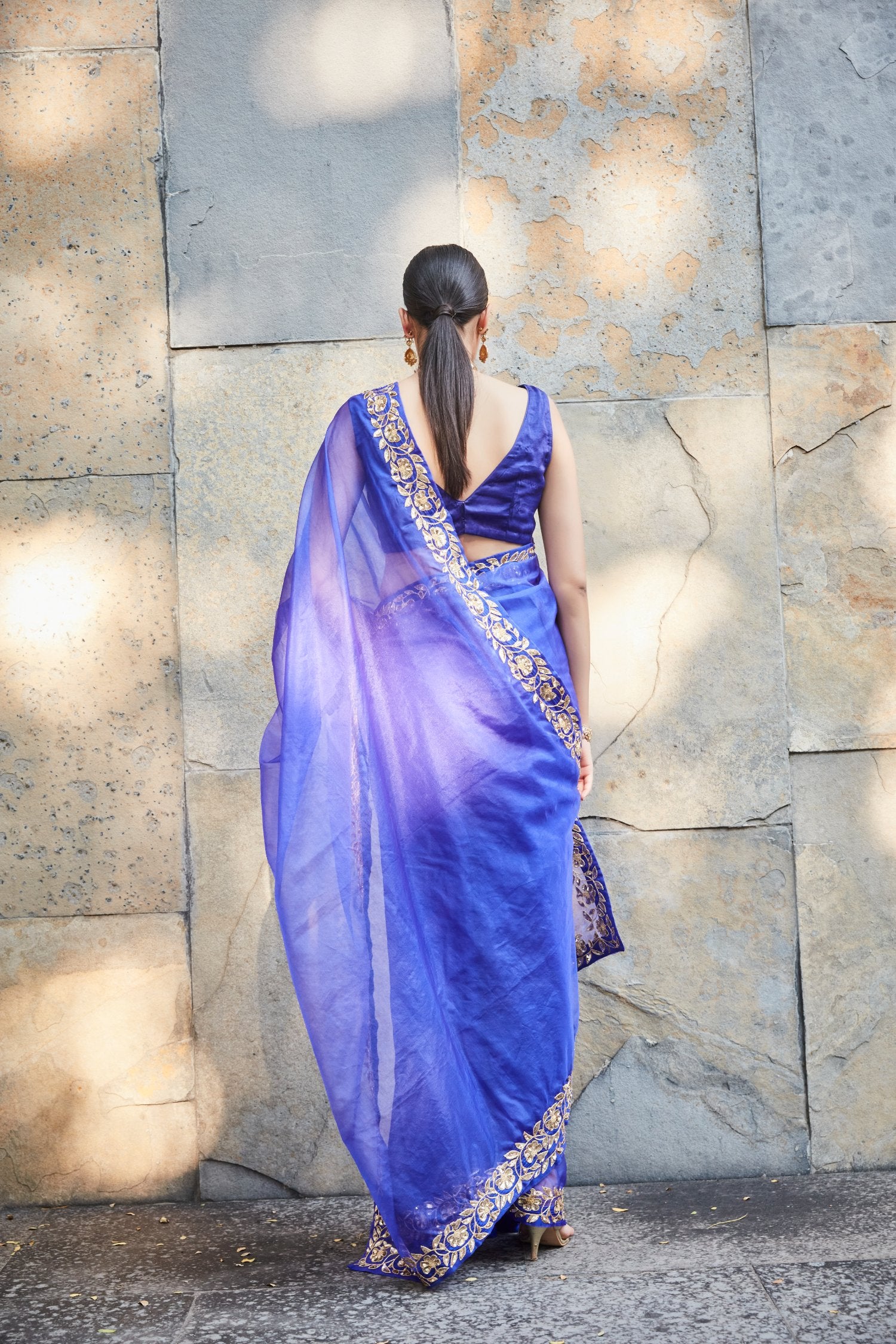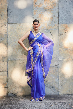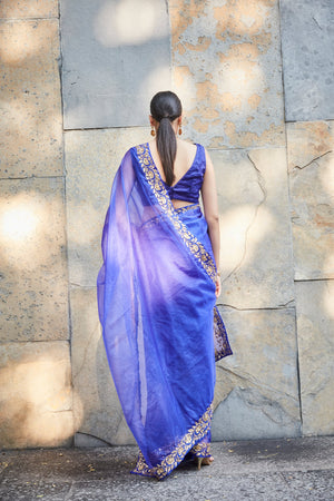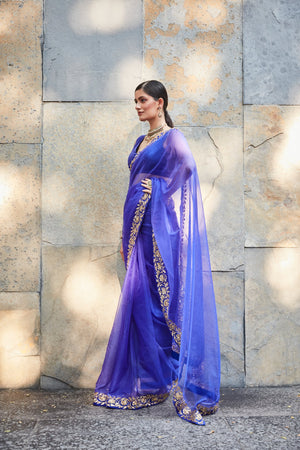 Purple Silk Organza Saree With Delicate Floral Pattern Border In 3D Sequence And Zari. Teamed Up With A Plain Satin Silk Blouse.