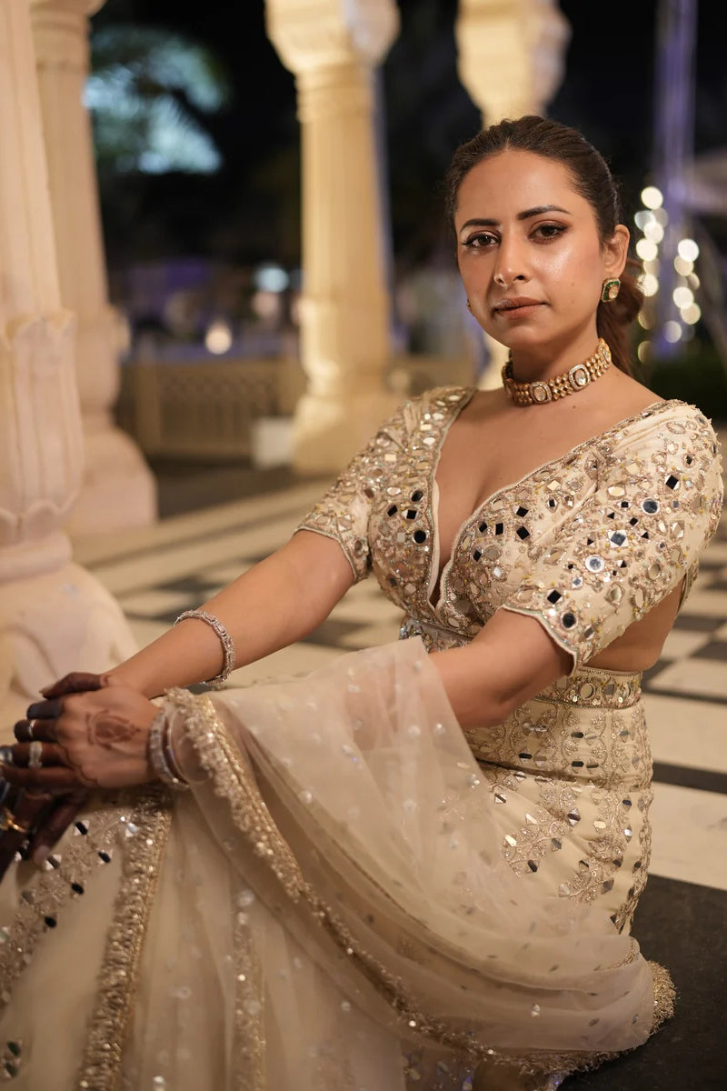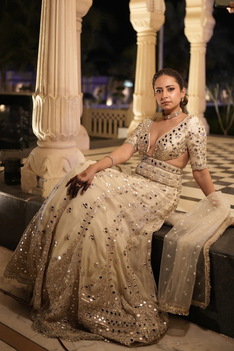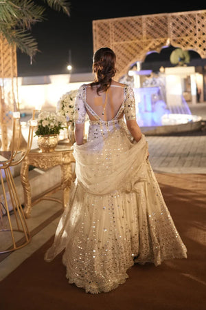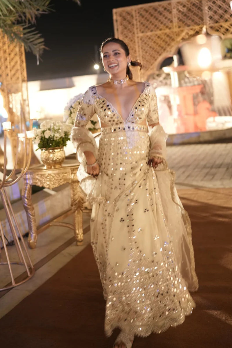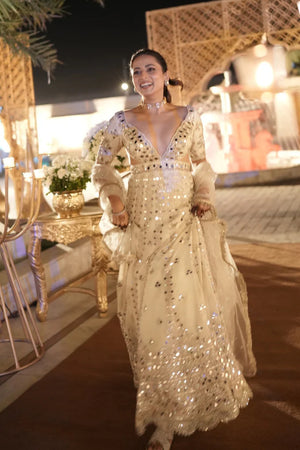 Featuring a deep V-neck anarkali with three-quarter sleeves, heavily embellished with intricate mirror and hand work on yoke, creating a dazzling effect. The outfit is complemented by pallazo and net dupatta with matching embellishments and a scalloped border.
