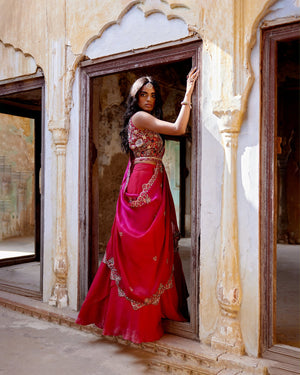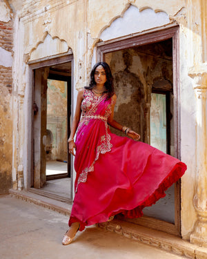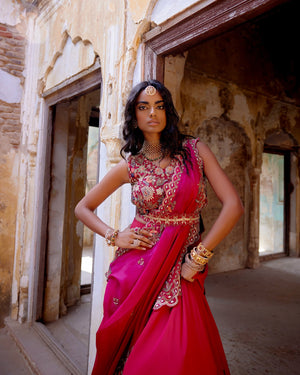 Antique Zardozi Hand Embroidered Silk Organza Drape Styled With A Blouse With A Detailed Back Cut, Styled With A Layered Crepe Skirt And Belt