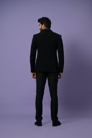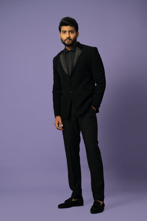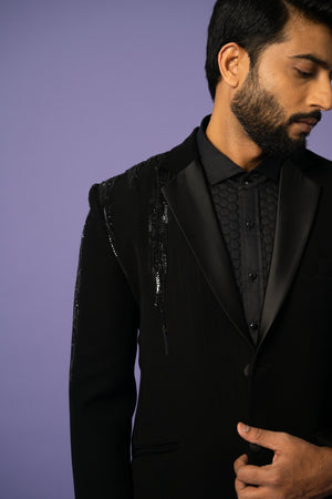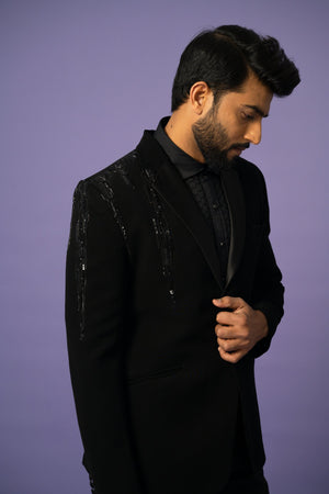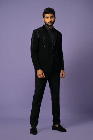 Featuring A Black Suit Set , .. The Blazer Has Gorgeous One Side Shoulder Embellishments In Katdana, Sequins, Chid Work. It Is Paired With Black Trousers.