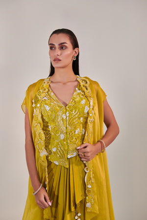 Satin Organza Cape And Fitted Sleeveless Jacket And Drape Skirt Set