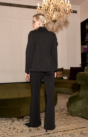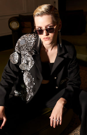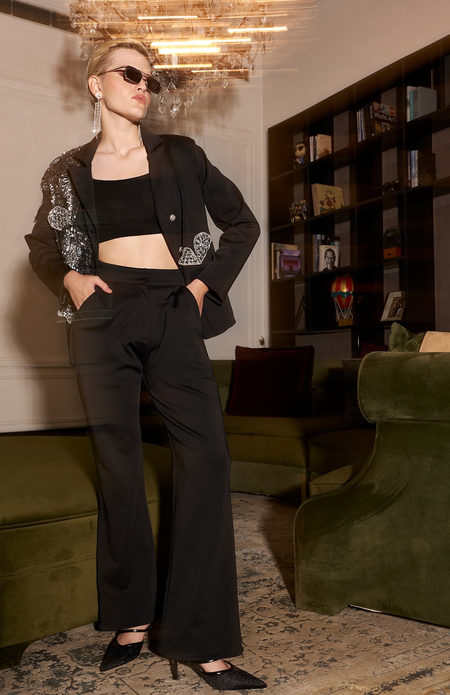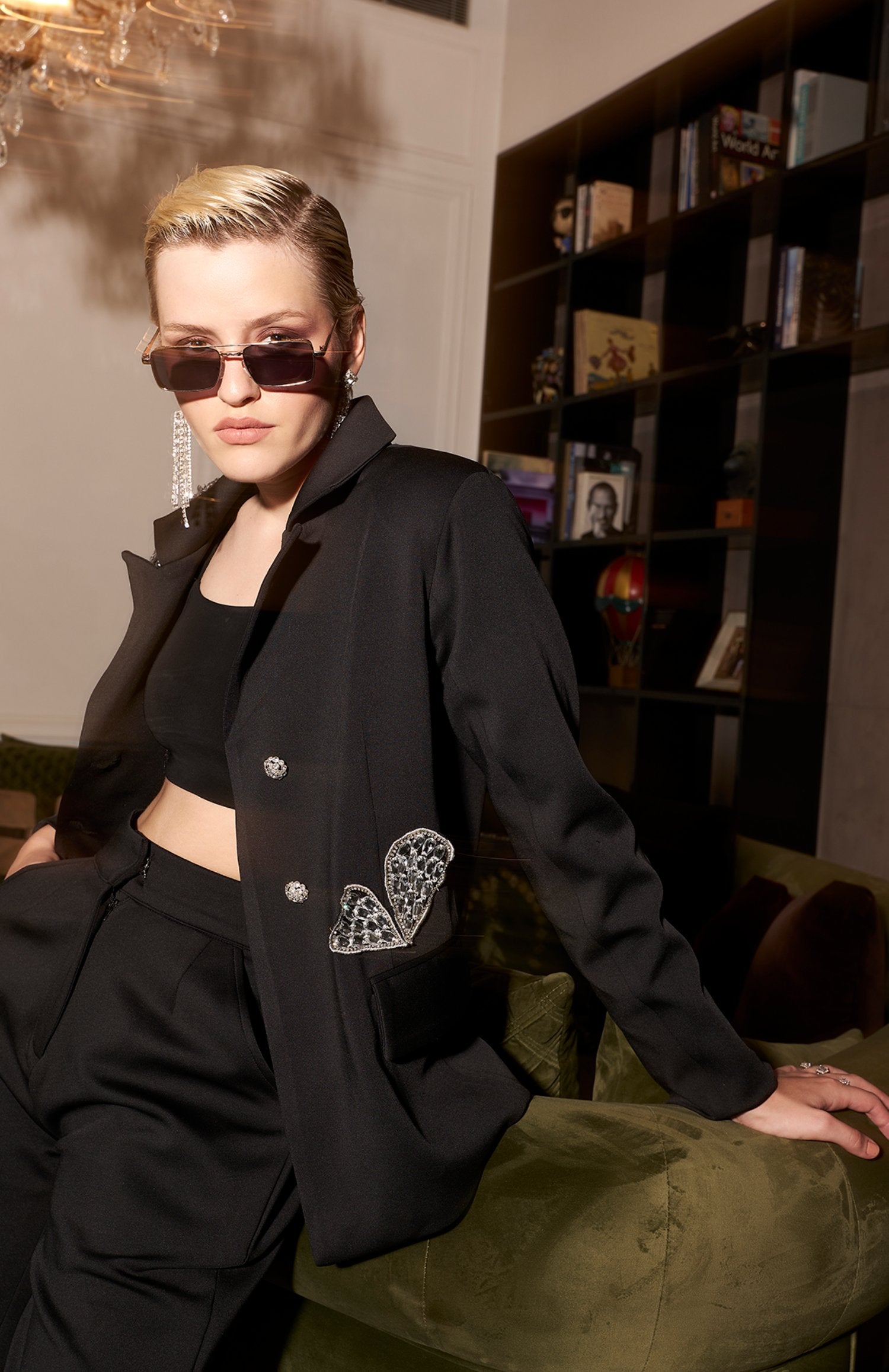 Dive into elegance with our black 3D flower blazer set. This ensemble is a work of art, featuring intricate floral details that add a touch of timeless charm to your outfit.