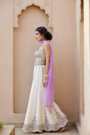 Mirror And Colorful Resham Embroidered Ivory Dupion Silk Top And Flared Pant Paired With Contrast Lavender Tulle Dupatta With Pearl Embroidery Detailing