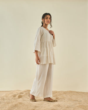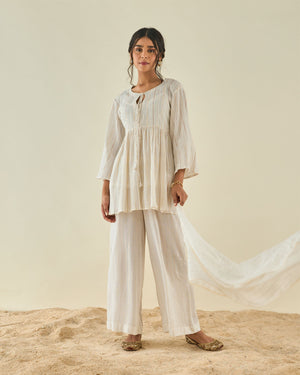 A Line Daisy White Striped Shimmer Cotton Kurta With Cozy Side Pocket Along With Statement Sleeves ,Paired With Craft Pants