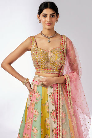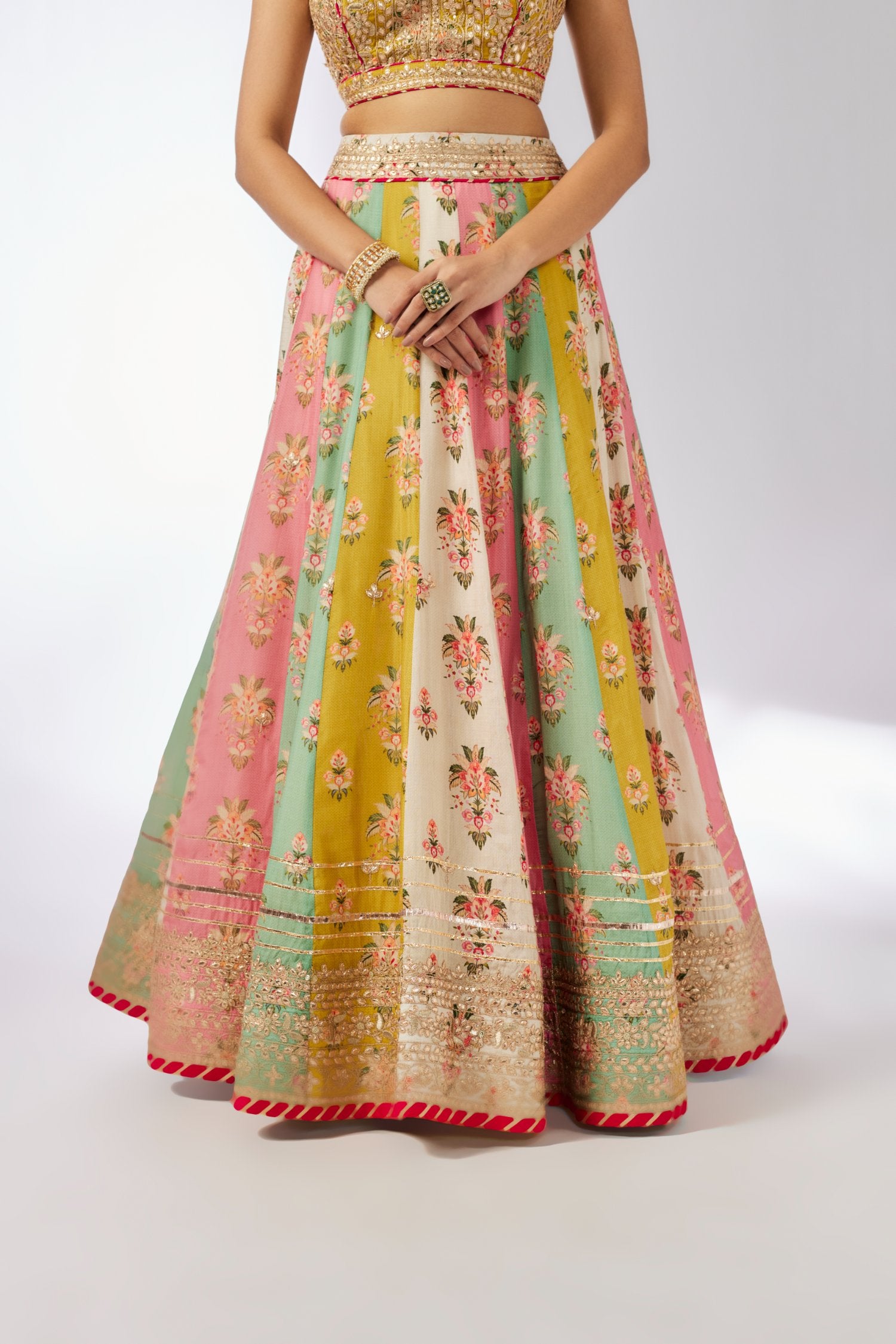 This Delicate Floral Multi Print In A Sophisticated Toned Down Hue, In A Soft, Full Skirt, Is Embellished In Gold Dori And Gota That Adds Shimmer All Along The Skirt Hem. The Fully Hand Embroidered Strappy Sleeveless Blouse And Net Tiki Dupatta With Trim, Add Shimmer And A Richness To This Pretty Ensemble.