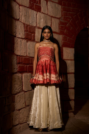 The peplum top, crafted in rich shades of vermilion and cream, showcases intricate hand-embroidered detailing with zardozi, beads, and threadwork that highlight its structured neckline and waist. The geometric and floral patterns give it a modern ethnic appeal while maintaining a traditional essence. The flared ivory tissue gold bottom in lustrous fabric balance the vibrancy of the top, adding a graceful flow to the silhouette. This outfit perfectly blends contemporary design with artisanal craftsmanship — ideal for festive gatherings, sangeet nights, or intimate celebrations.