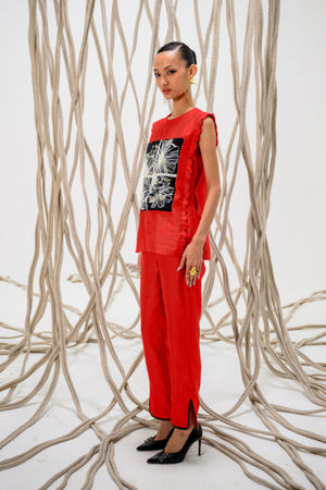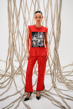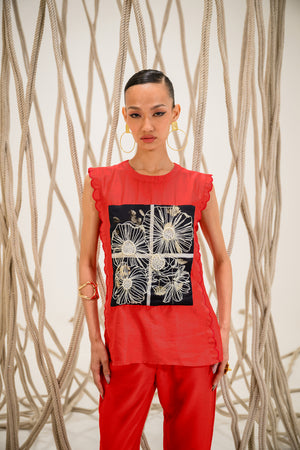 Step into the spotlight with the Scarlet Top—where bold red meets vintage vibes! A dazzling black moon patch, decked out in 3D floral pearls, adds a photogenic twist, while scallop details bring all the feminine feels. Sleeveless, sassy, and ready to turn heads—because who says you can't mix vintage with a dash of vavoom?