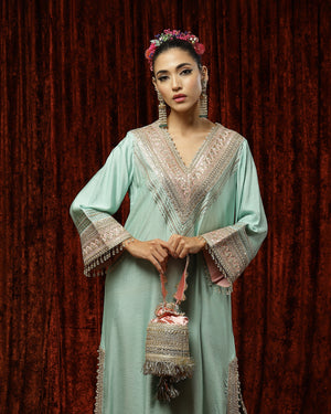 Featuring a Sea Green & Baby Pink Kurta kaftan in Silk Chanderi and with fine gota, dori, badla work.