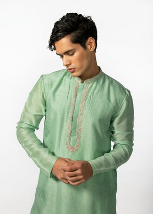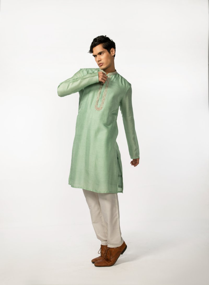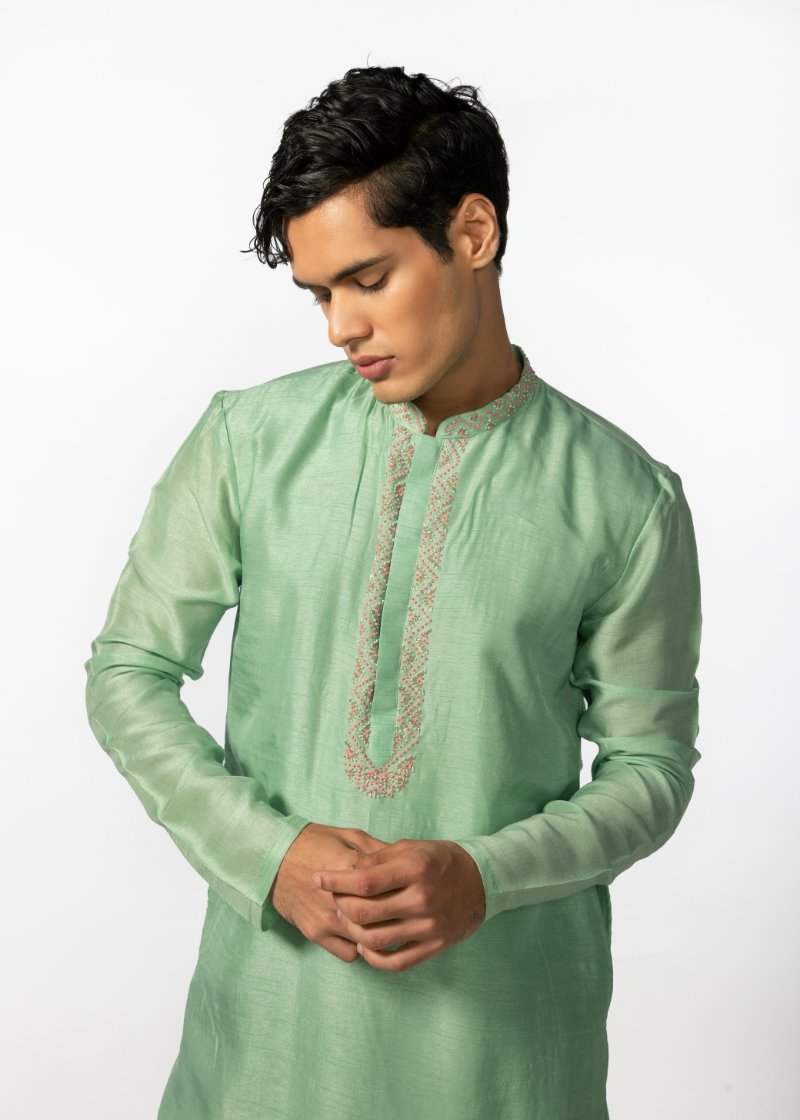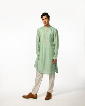 Vibrant sea green kurta with hand emboidery detailing on placket and collar, is complimented with a pair of pant pajama. Kurta Length- 42''. **The color may slightly vary due to screen lighting.