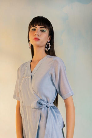 Wrap around kurta with long one sided bottom hem, sequin embroidery on front panel,easy to wear and trendy paired with cotton pants