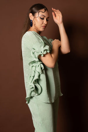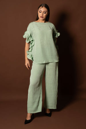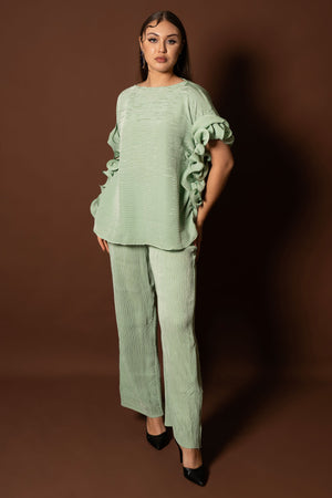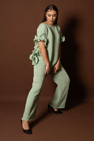 Picture a stunning green co-ord set with a crushed fabric look, exuding elegance and charm!