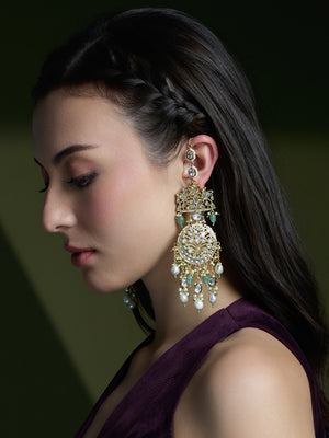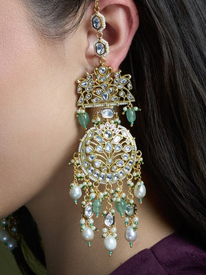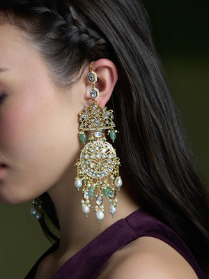 Make a royal statement with these gold kundan passa earrings, adorned with intricate detailing, pearl drops, and green bead danglers. Perfect for bridal looks, sangeet nights, and festive occasions.