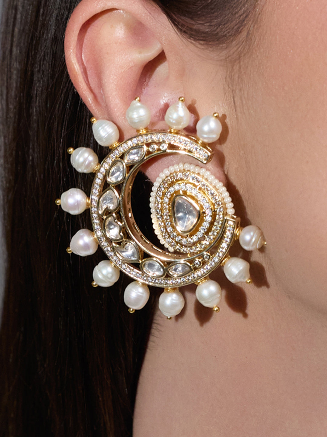 Elevate your ethnic look with these regal circular stud earrings, featuring radiant kundan work and pearl accents. Perfect for weddings or festivals, they blend tradition, elegance, and timeless charm beautifully.