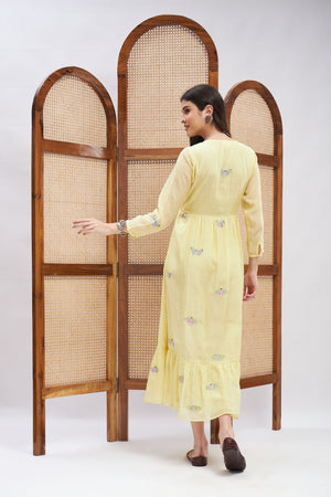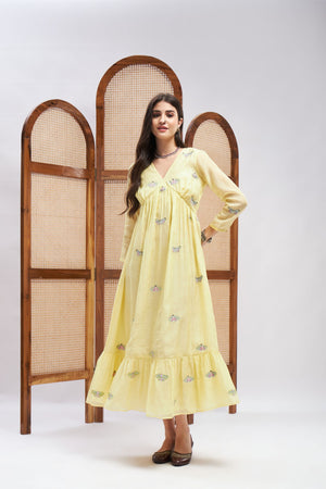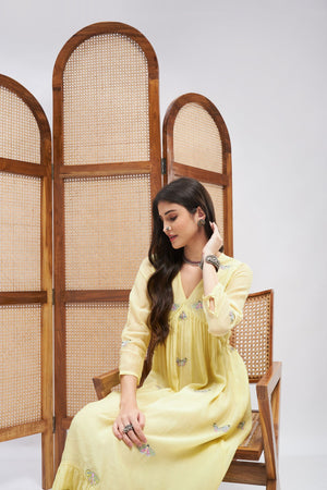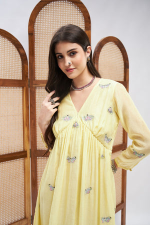 Yellow Silk Chanderi Dress. This enchanting Yellow Long V-Neck Underbust Dress with Full Sleeves and Butterfly motifs is a whimsical and elegant creation that promises to make you the epitome of grace and charm. This dress is designed to captivate hearts with its vibrant color, unique underbust detailing, and delicate butterfly motifs.