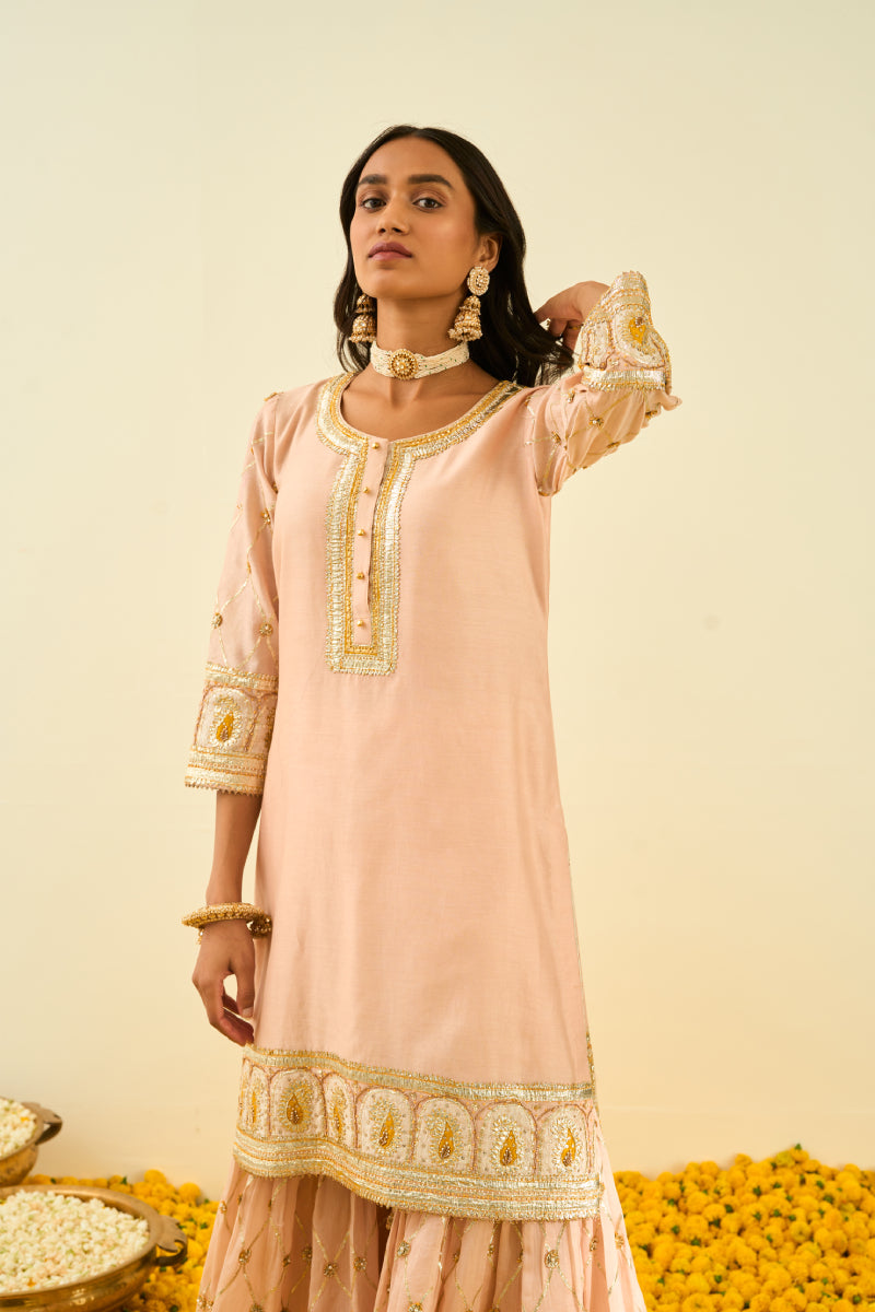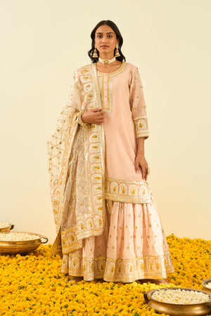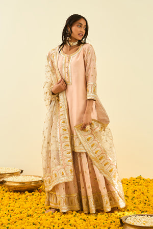 The Shabina ensemble from the Noor collection is made using a pure chanderi silk fabric, crafted with gotapatti and highlighted with basra moti. It features a zero neck with a placket and three-quarter sleeves. The look comes together with garara and a silk organza Odhni. The outfit is finished using an exclusive Chanderi Silk Banarsi fabric and Gota.