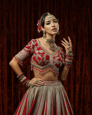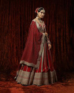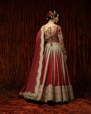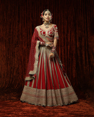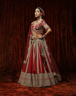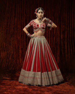 "Featuring Ruby lehenga with gota and zari work. Paired with matching silk Chanderi embroided blouse and georgette dupatta ".