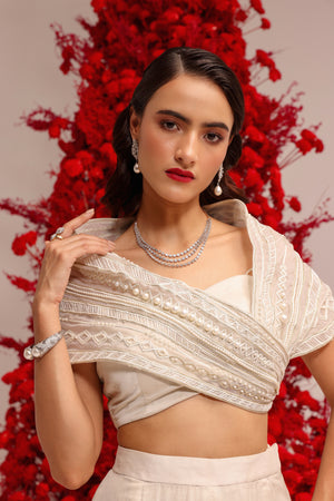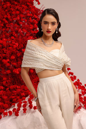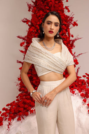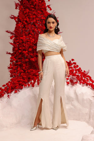 White wrap around with resham cutwork and pearl embelished. Paired with center slit pants