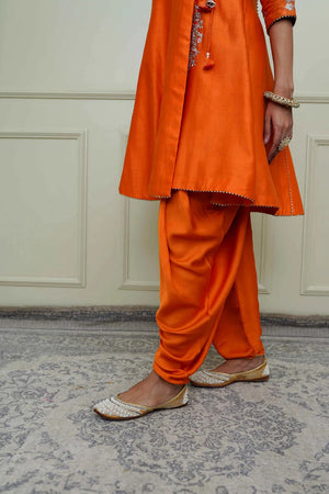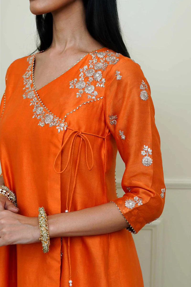 The Shafira ensemble is enhanced with our signature exquisite Kashmiri Tilla embroidery. It features a V neck at the front along with three-quarter sleeves. The Anghrakha can be pulled close with a tie-up design. It is teamed up with a cowl dhoti. The embroidery is highlighted with very fine ivory pearls. The technique is an age-old tradition & one shall cherished it forever. The outfit is finished using a chanderi silk banarsi fabric and gota.