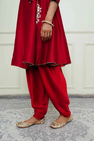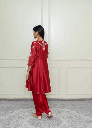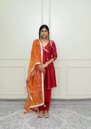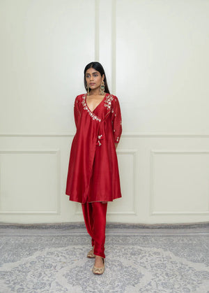 The Shafira ensemble is enhanced with our signature exiquisite Kashmiri Tilla embroidery. It features a V neck at the front along with three-quarter sleeves. The Anghrakha can be pulled close with a tie-up design. It is teamed up with a cowl dhoti. The embroidery is highlighted with very fine ivory pearls. The technique is an age-old tradition & one shall cherished it forever. The outfit is finished using a chanderi silk banarsi fabric and gota.