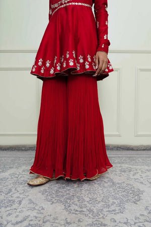 The Shahana emsemble is enhanced with our signature Kashmiri Tilla embroidery. It features a zero neck with chooridaar sleeves. The peplum kurta is teamed up with a crushed garara and the yoke is highlighted with very fine pintucks. The embroidery is highlighted with very fine ivory pearls. The technique is an age-old tradition & one shall cherish it forever. The outfit is finished using a chanderi silk banarsi fabric and gota.