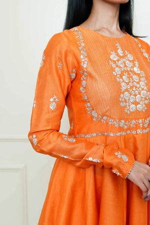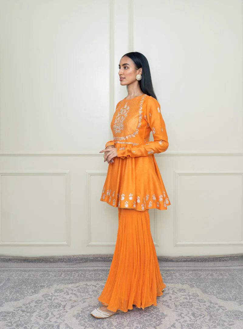 The Shahana emsemble is enhanced with our signature Kashmiri Tilla embroidery. It features a zero neck with chooridaar sleeves. The peplum kurta is teamed up with a crushed garara and the yoke is highlighted with very fine pintucks. The embroidery is highlighted with very fine ivory pearls. The technique is an age-old tradition & one shall cherish it forever. The outfit is finished using a chanderi silk banarsi fabric and gota.