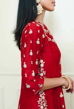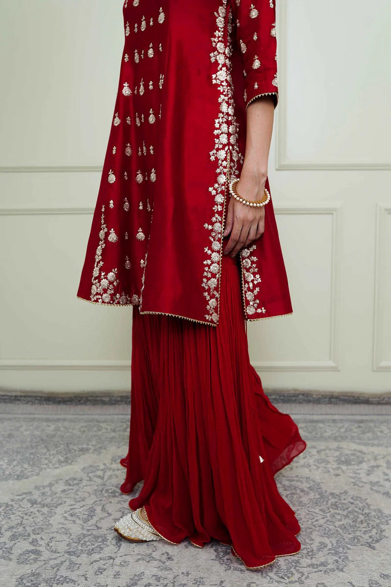 The Shahira emsemble is enhanced with our signature Kashmiri Tilla embroidery. It features a princess-cut A-line kurta with zero neck and three-quarter sleeves. The kurta is teamed up with a crushed garara. The centre panel is highlighted with very fine bootis. The embroidery is highlighted with very fine ivory pearls. The technique is an age-old tradition & one shall cherished it forever. The outfit is finished using a chanderi silk banarsi fabric and gota.