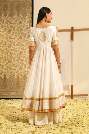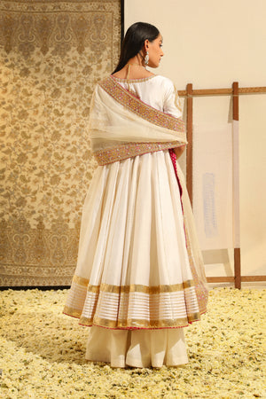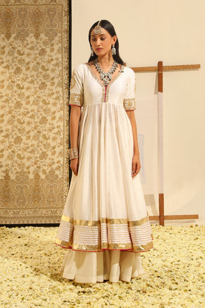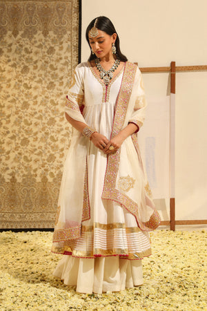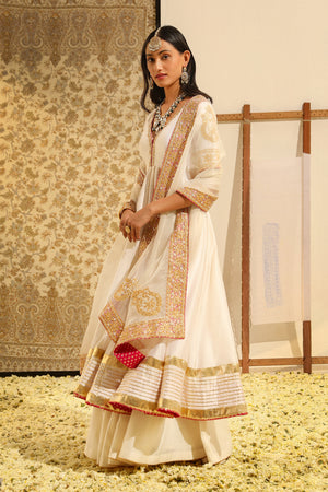 The Shaiz ensemble showcases intricate hand work on an ankle-length kalidaar anarkali, made in pure Silk Chanderi fabric. This luxurious and comfortable fabric is embellished with heritage Gota Patti and Dabka Zardozi Embroidery. The ensemble is teamed up with a skirt and a silk organza dupatta. The look features a broad V neck on the front, a zero back and elbow sleeves. The outfit is highlighted with Barsa Moti's and finished with an exclusive Chanderi Silk Banarsi Fabric.