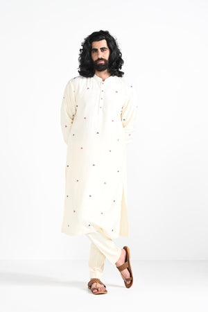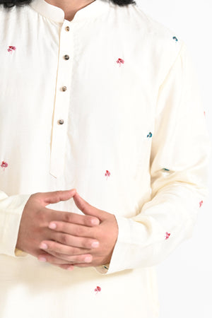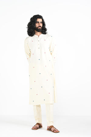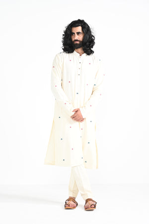 butta hand thread work embroidered on bamberg raw silk.Paired with Buttercream slim fit Pant Pajama. Color of the actual garment may vary due to lighting conditions during the shoot .